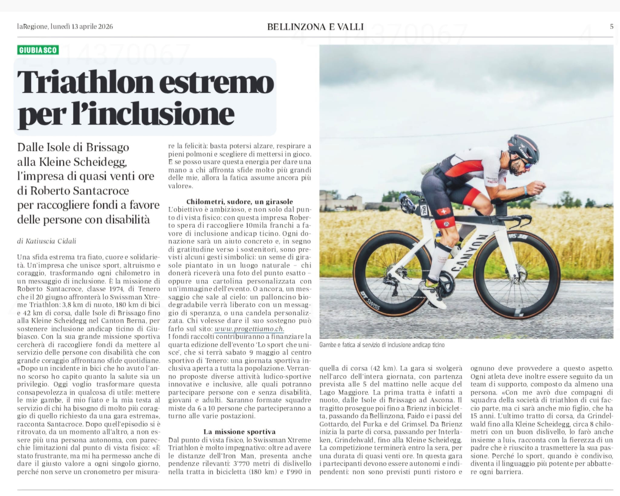 Il nostro progetto di raccolta fondi per inclusione andicap ticino ha attirato l’attenzione dei media: La Regione ha dedicato un articolo alla sfida del triathlon estremo come gesto di solidarietà e inclusione..